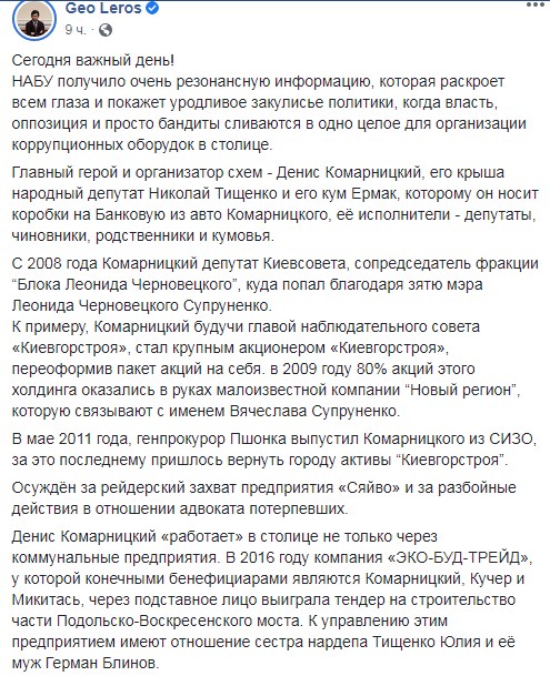 "Сьогодні о 09:00 у мене був брифінг в НАБУ, де я надав безпрецедентні докази топ-корупції в місті Києві. Де главою цієї ОЗГ (організованої злочинної групи - "Апостроф") є Андрій Єрмак, є його кум і наш колега по фракції (Лерос мав на увазі Миколу Тищенка - "Апсотроф"), де Денис Комарницький, "приглядаючий" за Києвом, направляє всі "потоки" через Андрія Єрмака, і зараз зосереджуються ці кошти на місцевих виборах", - заявив Лерос з трибуни парламенту.
