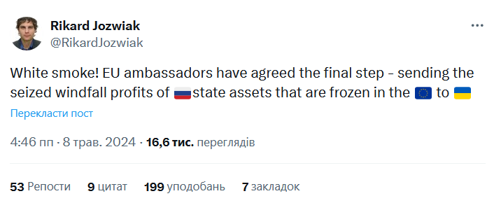 "Посли ЄС погодили останній крок - відправку арештованих надприбутків від російських державних активів, які заморожені в Європейському Союзі, до України", - написав кореспондент.