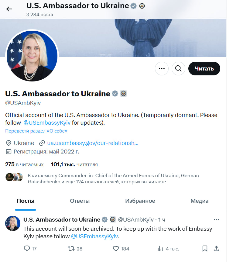 "Незабаром цей акаунт буде заархівовано. Щоб бути в курсі роботи Посольства в Києві, будь ласка, слідкуйте за @USEmbassyKyiv",- йдеться в повідомленні.