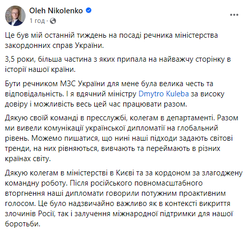 Олег Ніколенко повідомив, що розпочинає свій новий дипломатичний розділ, де й надалі буде максимально плідно працювати на благо інтересів України.