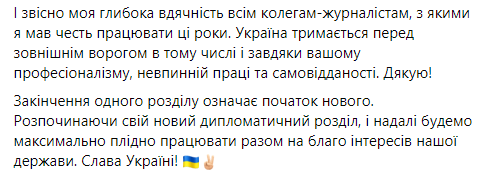 Вже колишній речник МЗС подякував міністру Дмитру Кулебі, журналістам та колегам по департаменту, разом з якими, відзначив він, комунікації української дипломатії були виведені на глобальний рівень.