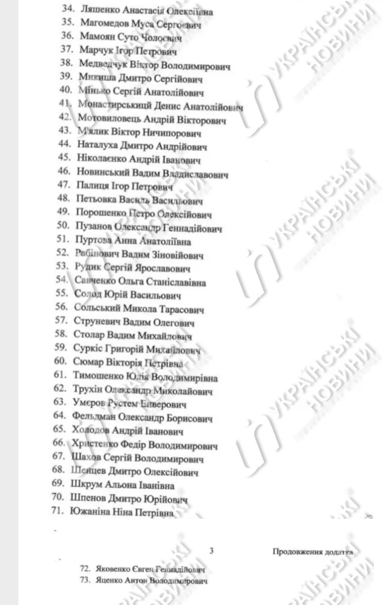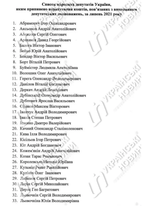 Також цих виплат позбавлені глави аграрного комітету Микола Сольський, депутати від "Опозиційної платформи" Віктор Медведчук, Ілля Ківа, Тарас Козак, депутат від групи "Довіра" Сергій Шахов, позафракційні депутати Олександр Дубинський і Гео Лерос.