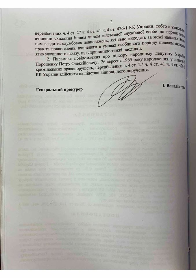 За його словами, раніше Венедиктова порушила норми статті 110 Кримінально-процесуального кодексу та не оформила постановою своє рішення про доручення іншій особі повідомити про підозру Петру Порошенко.