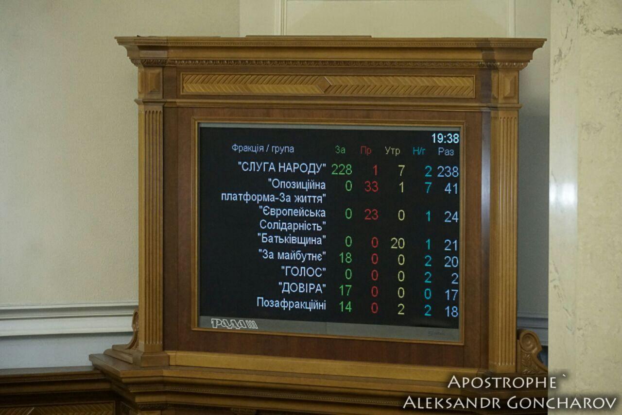 "Слуга народу": "за" - 228, "проти" - 1, "утрималися" - 7, "не голосували" - 2.