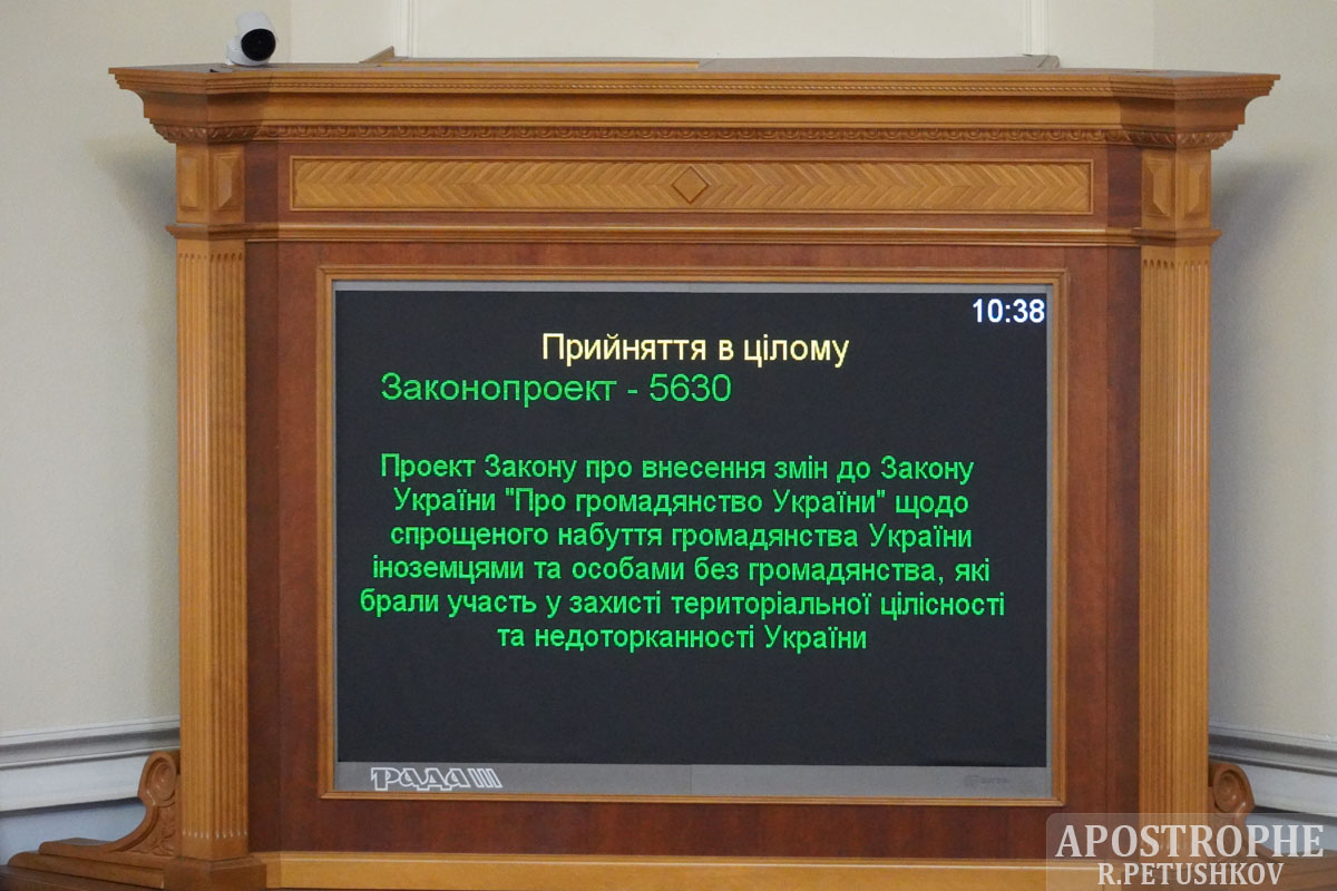 У вівторок, 14 грудня, Верховна Рада ухвалила Закон України "Про внесення змін до Закону України "Про громадянство України" щодо спрощеного набуття громадянства України іноземцями та особами без громадянства, які брали участь у захисті територіальної цілісності та недоторканності. України.