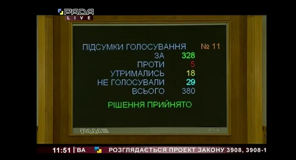 "За" проголосували 328 народних депутатів, "проти" - лише п'ять. Трансляція засідання пройшла на YouTube-каналі телеканалу "Рада".