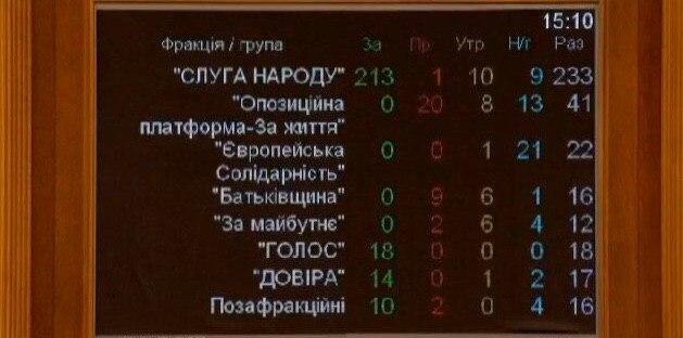 "Слуга народу": "за" - 213, "проти" - 1, "утрималися" - 10, "не голосували" - 9.