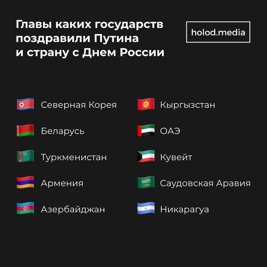 23:00 Стало відомо, глави яких держав привітали Путіна з т.зв. "дном Росії". Вони розділилися на дві чіткі групи - жебраки-сателіти та багаті виробники вуглеводнів. Судячи з усього, перші розраховують випросити у кремлівського господаря якусь подачку, другі вирішили познущатися з бункерного діда перед розділом нафтогазового "пирога", який почнеться після того, як Росію викинуть зі світового ринку. Тільки неясно, куди віднести Туркменістан - до "красивих" чи "розумних"?