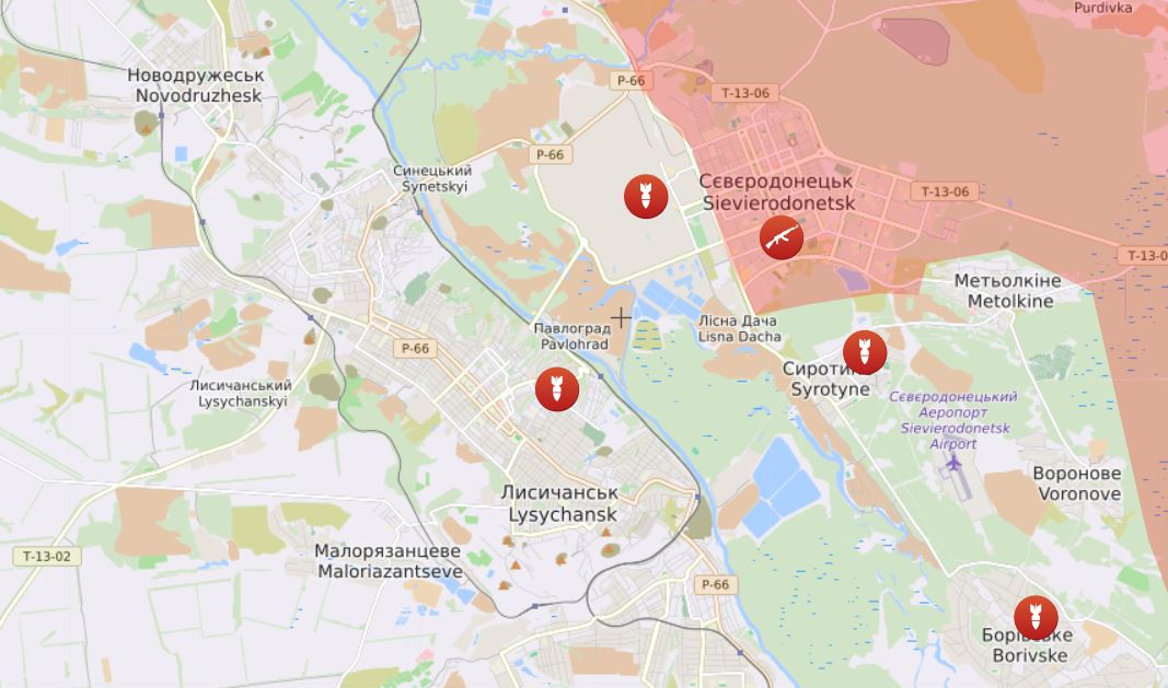 18:25 На Сєвєродонецькому напрямку окупанти продовжують обстріли позицій Сил оборони та цивільної інфраструктури в районах населених пунктів Сєвєродонецьк і Лисичанськ. Ворожа штурмова авіація завдала авіаударів в районах населених пунктів Устинівка та Борівське. Крім того, поблизу Борівського противник вів штурмові дії, успіху не мав.