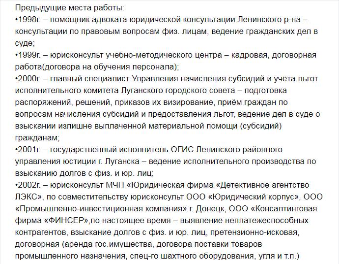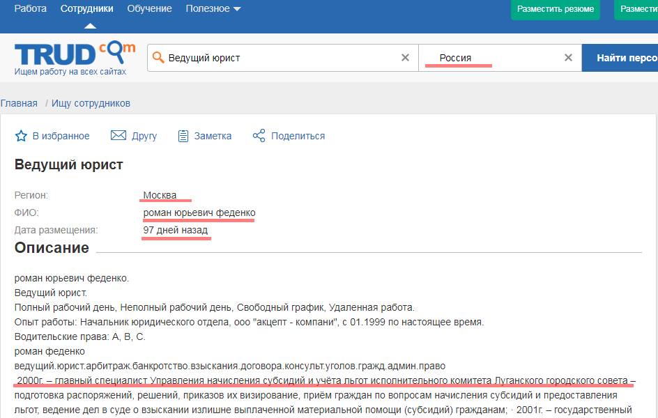 "Цікаво, що був Феденко юристом і ще в листопаді 2017 року розміщував резюме в якості здобувача місця роботи в якості юриста. Резюме розміщував в Києві (!), правда, з готовністю переїхати в Донецьк або Луганськ. Також намагався знайти роботу в Москві (скріншот резюме додаю). Додаю також скріншот частини його резюме в Україні. Крім того, є скрінщот його заяви-скарги на дії російських прикордонників на КПП Новошахтинськ-Должанське щодо нього в лютому 2016 року ", - йдеться в повідомленні.