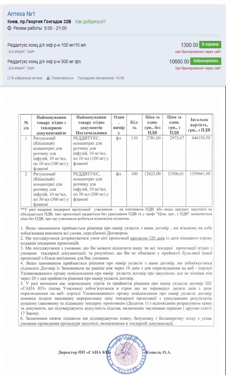 Так, незмінний переможець тендерів онкодиспансеру - ПП "Сана Ко" - поставляє препарати за цінами, що значно перевищують ринкові. Наприклад, індійський препарат "Реддітукс" фірма поставляє за ціною майже 3 тис грн за 10 мл і 13,5 тис грн за флакон 50 мл. При цьому в багатьох роздрібних аптеках цей препарат коштує значно дешевше: 1,3 тис грн і 10,6 тис грн відповідно.