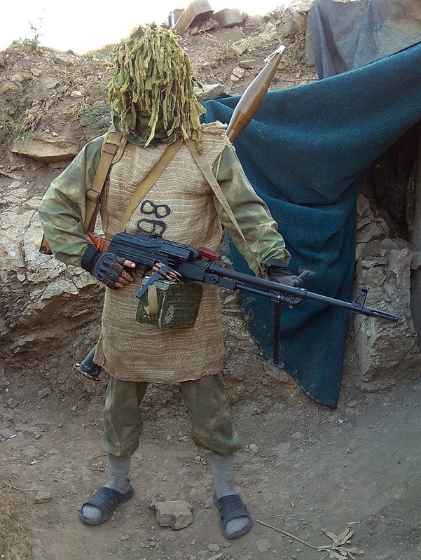 На голові у бойовика надітий маскувальний шолом, обличчя приховано балаклавою, поверх куртки надіто мішок з прорізами, штани заправлені в шкарпетки, а взутий він у гумові капці.