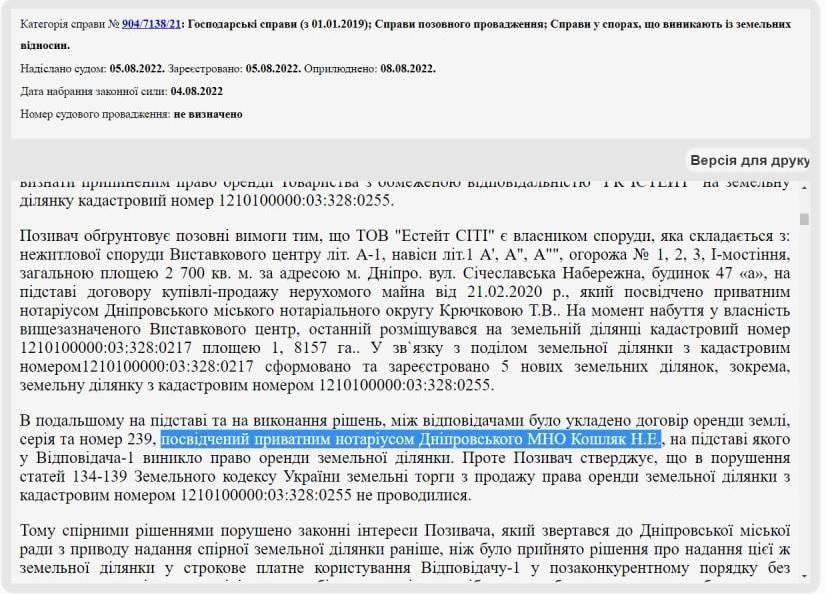 ТОВ "ГК Істейт", яку пов'язують із Геннадієм Корбаном, у квітні 2021 одержало під багатоповерхову забудову ділянку на набережній Дніпра. Як сказано у рішенні суду, який згодом виніс заборону на це будівництво, незаконний договір оренди запевнила нотаріус Наталія Кошляк.