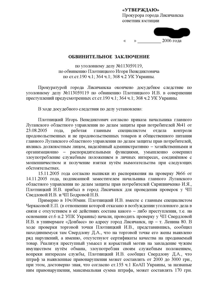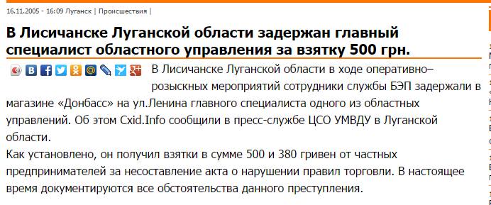 Блогер опублікував скріншот з інформаційного порталу, в якому повідомляється про затримання Плотницького на хабарі, і перші 2 сторінки матеріалу слідства прокуратури Лисичанська.