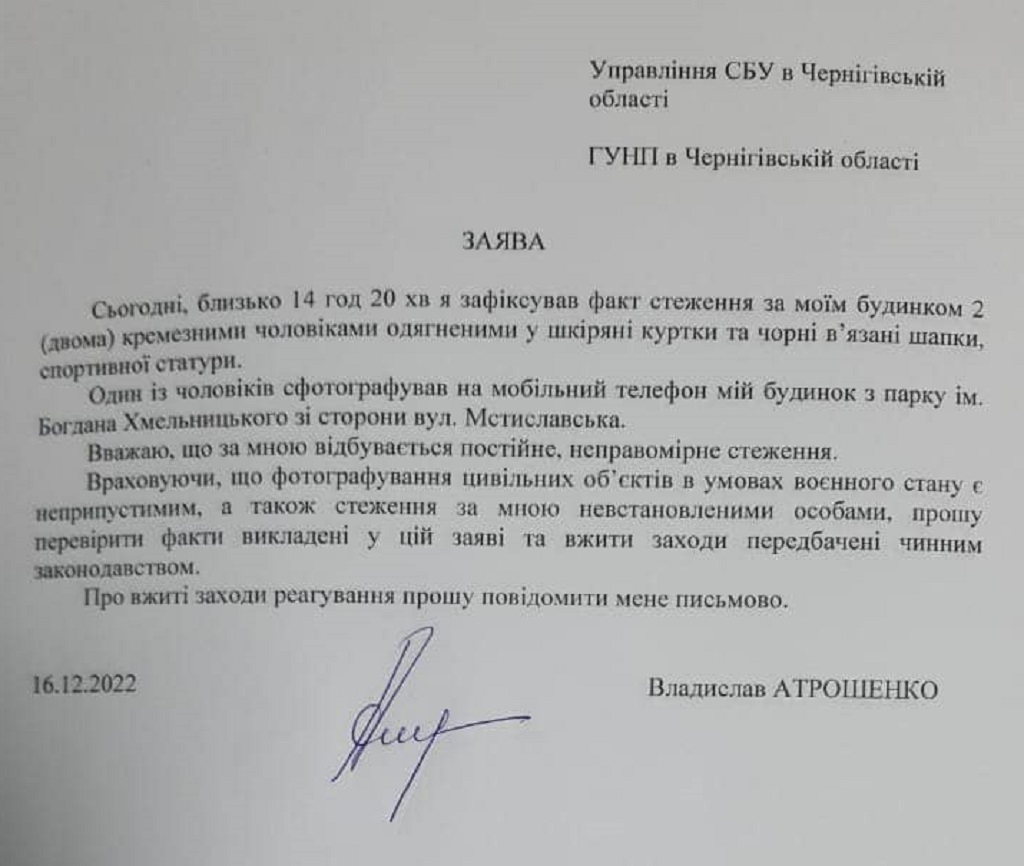 "Сьогодні, близько 14 год 20 хв я зафіксував факт стеження за моїм будинком двома кремезними чоловіками, одягненими у шкіряні куртки та чорні в"язані шапки, спортивної статури. Один з чоловіків фотографував на мобільний телефон мій будинок з парку ім. Богдана Хмельницького зі сторони вул. Мстиславська. Вважаю, що за мною відбувається постійне, неправомірне стеження", - написав Атрошенко.