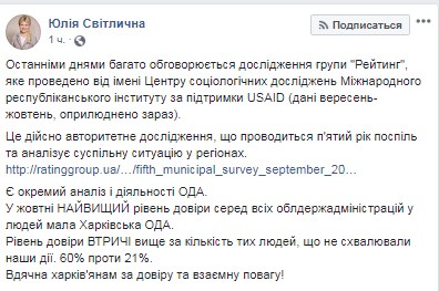 Колишня глава Харківської області Юлія Світлична прокоментувала опубліковані результати в Facebook, і окремо подякувала харків'ян за підтримку.