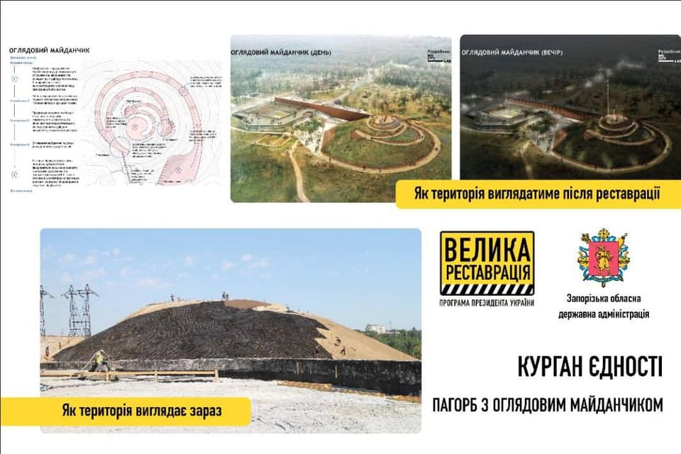 "Вже до Дня Незалежності відкриють Курган Єдності – найвищу точку острову, з якої відкривається неймовірна панорама на Дніпро і Запоріжжя. І вперше в історії на 16-метровий курган зможуть піднятися всі охочі, незалежно від віку і стану. Цим особисто опікується Перша Леді України Олена Зеленська", – зазначив Кирило Тимошенко.