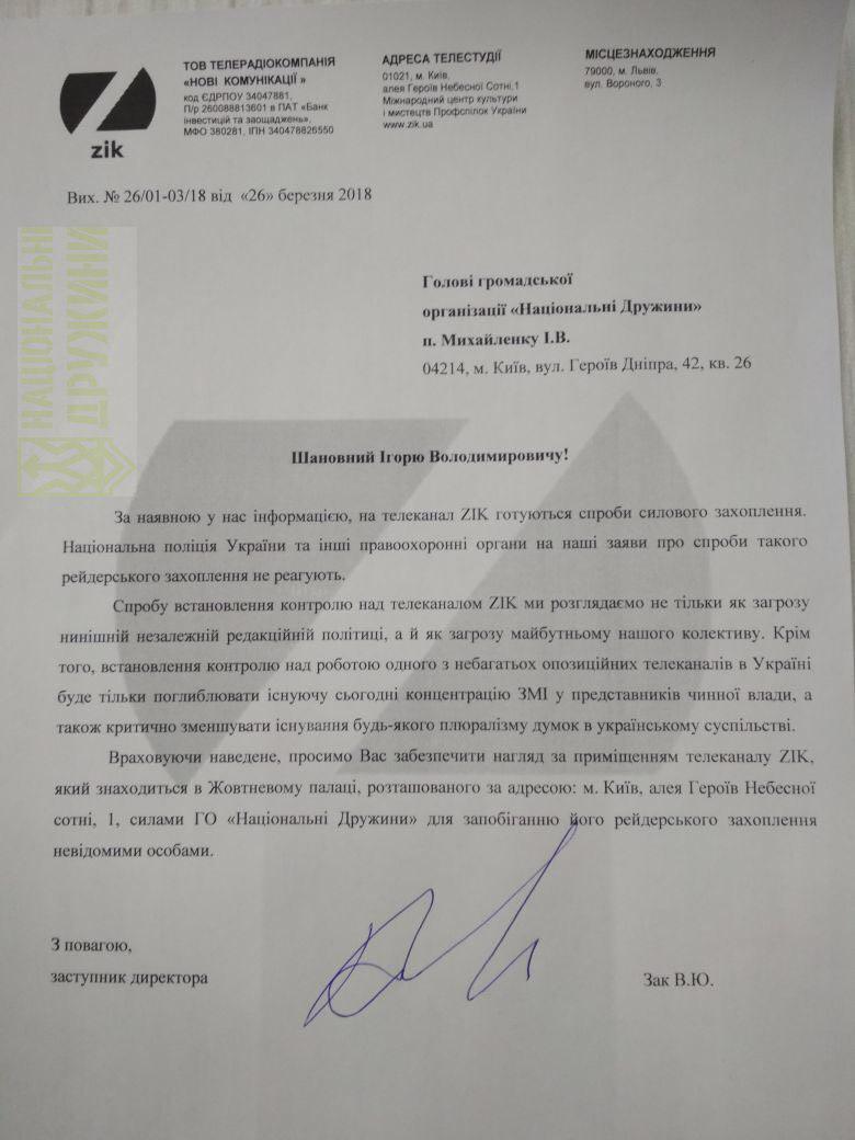 Раніше телеканал ZIK заявив, що на нього готується атака, а Нацгвардія з 1 березня розірвала договір охорони офісу каналу по наказу голови ВМС Аресена Авакова.