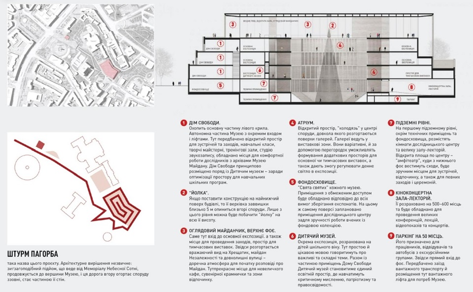 До складу меморіального комплексу, окрім самого Музею, має увійти також маршрут "Штурм пагорба", що буде починатися від Меморіалу Небесної Сотні. Його зигзагоподібні повороти вестимуть до Музею, до складу якого увійдуть Будинок Свободи, Дитячий музей, кіноконцертний зал, фондосховище, оглядовий майданчик та інші тематичні та функціональні зони.