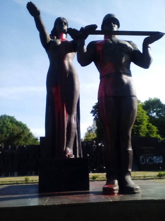 Невідомі написали на стелі монумента слово "окупанти" і облили червоною фарбою практично всі елементи пам'ятника.