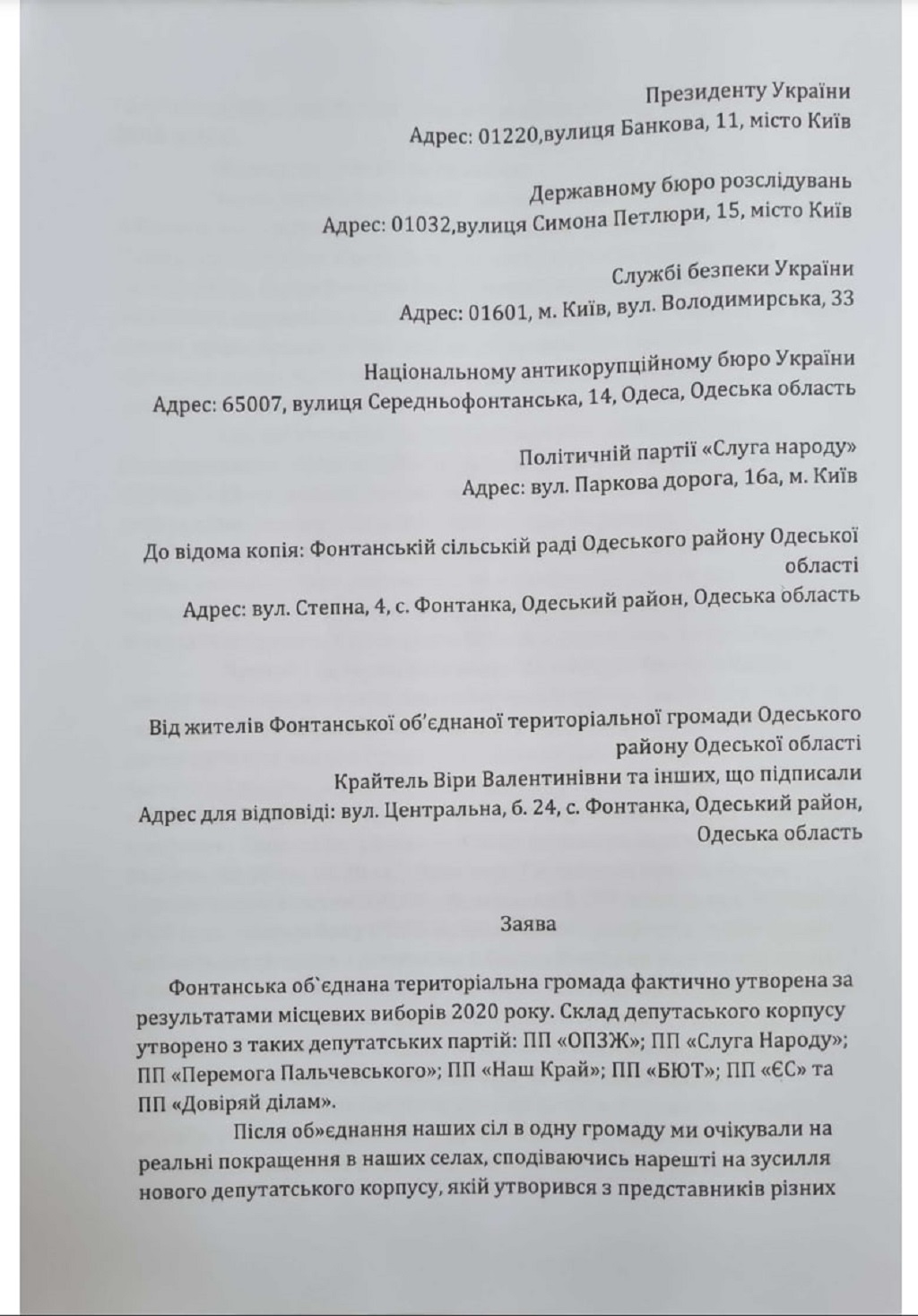Як пишуть громадяни, які підписали лист після виборів до місцевих органів влади восени 2020, люди сподівалися на кардинальне покращення життя в громаді за рахунок об'єднання зусиль представників різних політичних сил. Однак цього не сталося. Натомість жителі Фонтанської ОТГ побачили, як низка депутатів, очолювані депутатом Одеської обласної ради від партії "Слуга народу" Дмитром Ковбасюком та представником цієї ж політичної сили в депутатському корпусі громади Олени Вавилової, за участю депутатів від деяких інших партій, ведуть власну гру, щоб заволодіти землями територіальної громади та коштами місцевого бюджету".