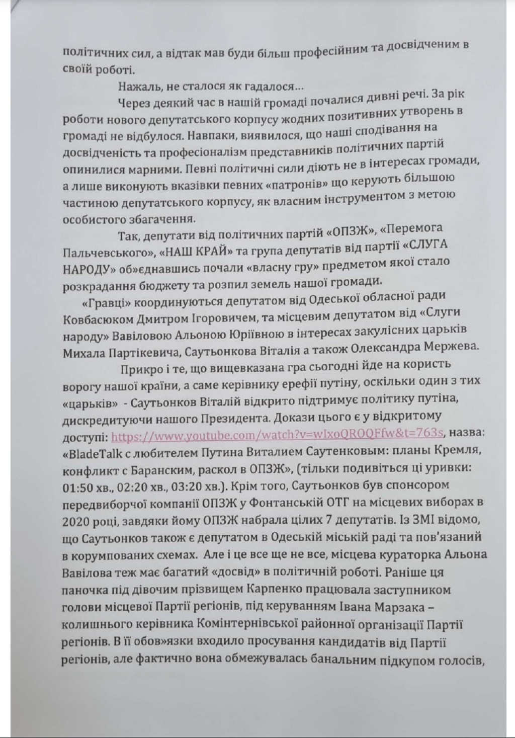 Мешканці Фонтанської ОТГ Одеського району Одеської області опублікували відкритий лист, згідно з яким активну роль у створенні різних шахрайських схем із землею громад та коштами місцевих бюджетів грають представники ОПЗЖ, забороненої в Україні партії.
