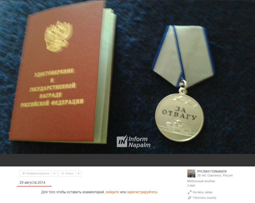 "Через 3 роки, Руслан Голишев опублікував фотографію медалі "За відвагу", вручену йому указом президента Росії від 22.10.2014 року і з відповідним коментарем. Крім неї, Голишев хвалиться медаллю за участь у російсько-грузинській війні 2008 року за підписом командира в/ч 54801", - йдеться в повідомленні.