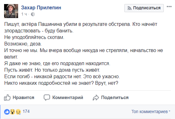 Раніше бойовик Назар Прилєпін повідомив про загибель Анатолія Пашинина на своїй сторінці в Facebook.