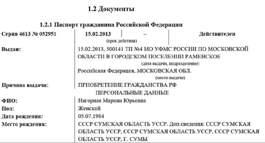 Зазначається, що через батька, який мешкає у Раменському районі Підмосков'я, РФ, у 2013 році вона отримала російські документи - 07.02.2013 вона подала заяву на отримання громадянства РФ і через тиждень отримала паспорт із пропискою. Її російські документи в базах РФ значаться як дійсні.