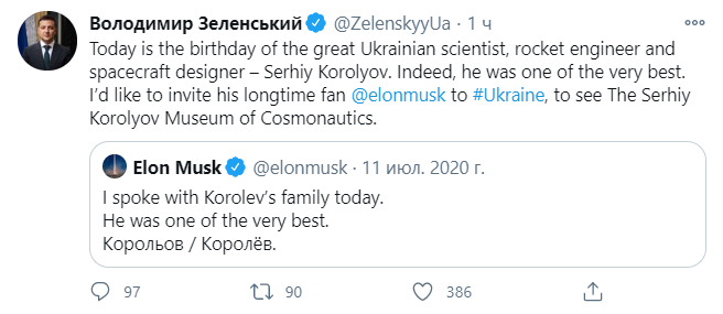"Сьогодні день народження великого українського вченого, ракетного інженера та конструктора космічних кораблів - Сергія Корольова. Дійсно, він був одним із найкращих. Я хотів би запросити його давнього шанувальника Ілона Маска в Україну, щоб побачити Музей космонавтики імені Сергія Корольова", - написав Зеленський, згадавши твіт Маска про його спілкування з родиною геніального конструктора.