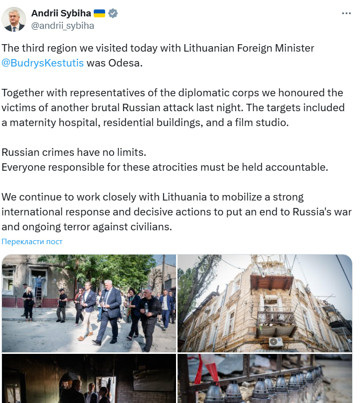 Міністр закордонних справ України Андрій Сибіга разом з литовським колегою Кястутісом Будрісом прибули в Одесу, яка зазнала жорстокого удару з боку РФ у ніч на 10 червня.
