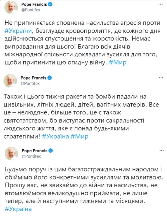 20:14. Папа Римський звернувся до світу з закликом негайного припинення бойових дій в Україні.