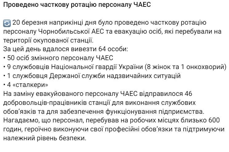 18:27. на ЧАЕС вдалося провести часткову ротацію персоналу. Про це повідомили у Енергоатомі.