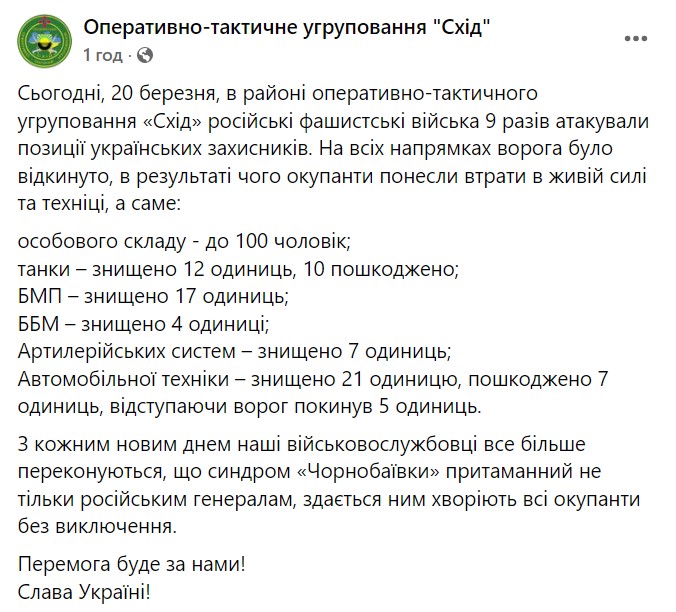 12:23. у Генштабі назвали втрати окупантів станом на ранок 20 березня