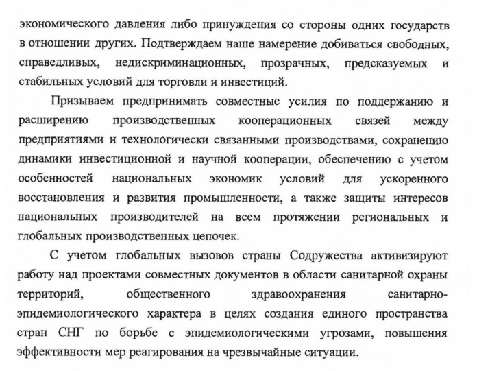 Планується, що в заяві голів країн СНД буде, серед іншого, сказано: "Закликаємо всі країни світу до відмови від торгових воєн, прийнятих в обхід Ради Безпеки ООН односторонніх санкцій та інших заходів економічного тиску або примусу з боку одних держав щодо інших".