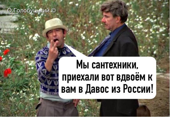 На карикатурі можна побачити героїв радянського фільму, один з яких нібито стверджує, що вони "сантехніки приїхали ось удвох до вас в Давос з Росії".