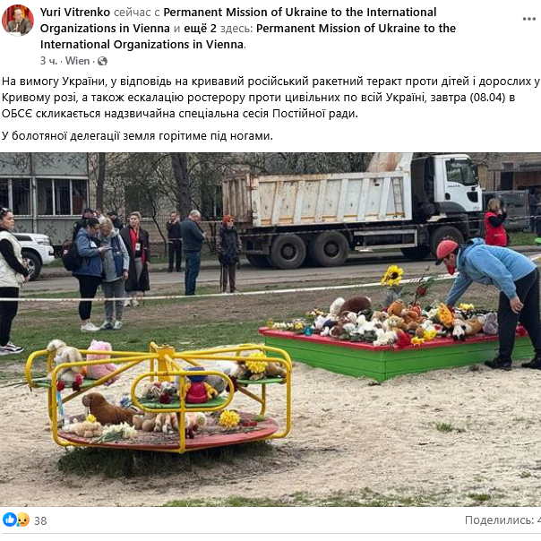 "На вимогу України, у відповідь на кривавий російський ракетний теракт проти дітей і дорослих у Кривому Розі, а також на ескалацію ростерору проти цивільних по всій Україні завтра (08.04) в ОБСЄ скликається надзвичайна спеціальна сесія Постійної ради. У болотяної делегації земля горітиме під ногами", - йдеться у дописі.