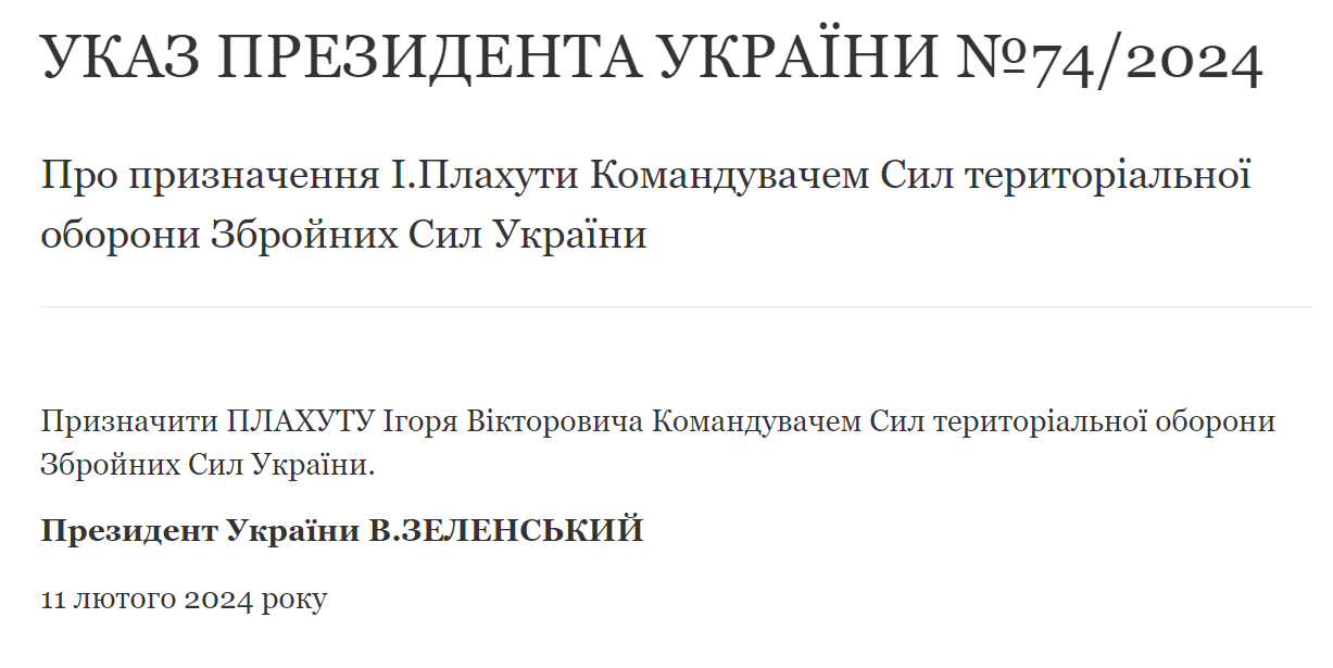 "Про призначення І.Плахути Командувачем Сил територіальної оборони Збройних Сил України Призначити Плахуту Ігоря Вікторовича Командувачем Сил територіальної оборони Збройних Сил України", - йдеться в указі №74/2024.