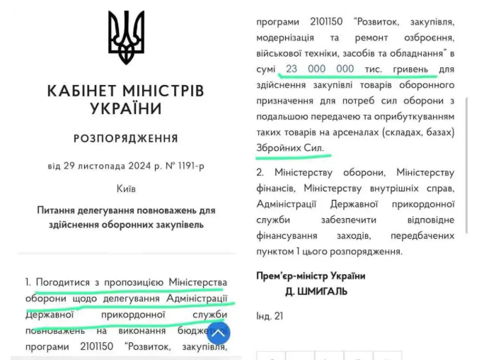 29 листопада прем'єр-міністр Шмигаль за поданням міністра оборони Умєрова ухвалив унікальне рішення: Державна прикордонна служба отримала 23 мільярди гривень Міноборони для закупівлі зброї для... Міноборони!