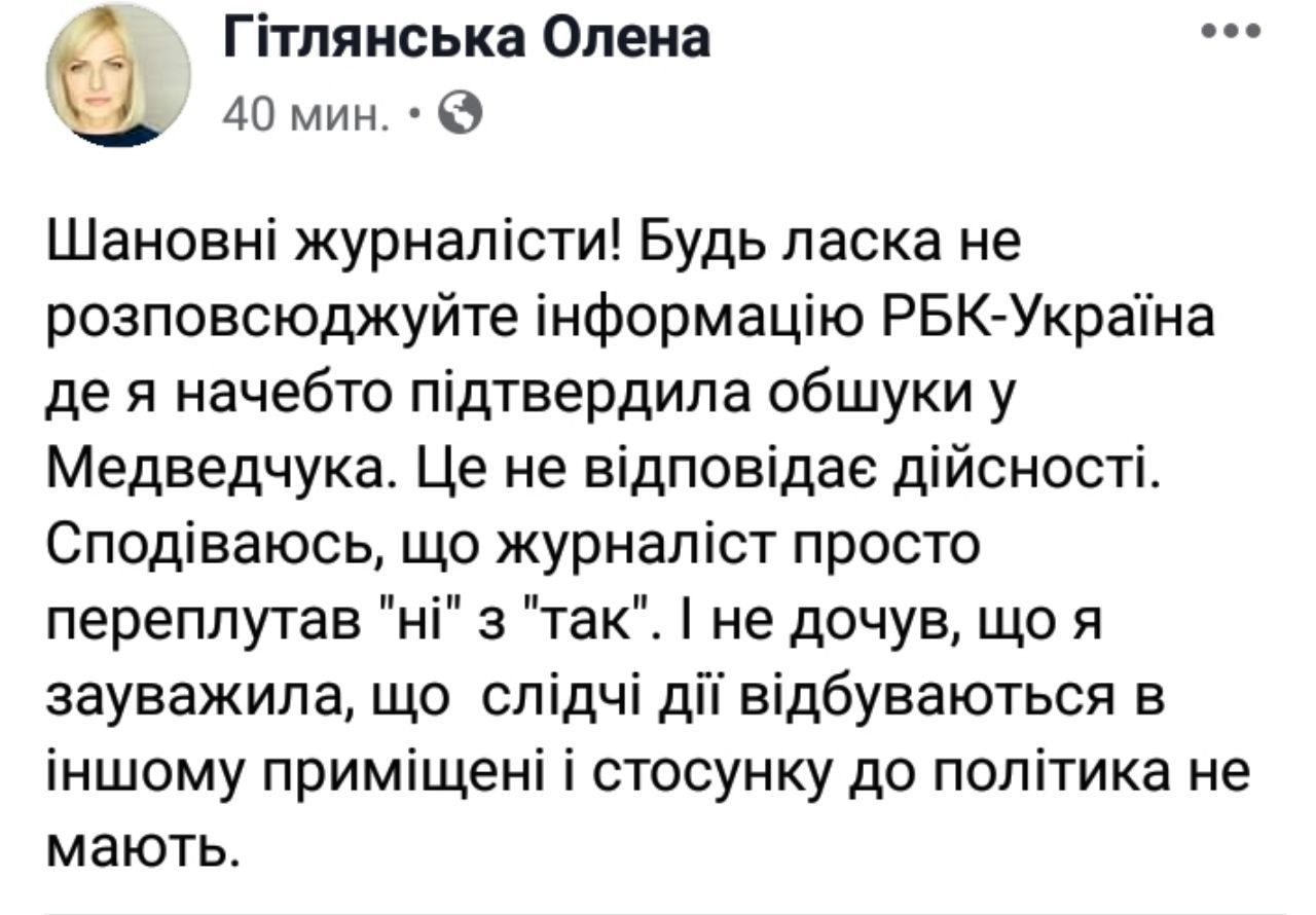 "Будь ласка, не розповсюджуйте інформацію РБК Україна, де я начебто підтвердила обшуки у Медведчука. Це не відповідає дійсності. Я зауважила, що слідчі дії відбуваються в іншому приміщенні і стосунку до політика не мають", - написала Гітлянська.