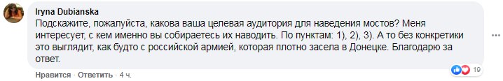 "Будь-який мирний процес починається з діалогу. Ми допоможемо людям по обидва боки лінії зіткнення слухати і чути. Вже багато зроблено. Але ще більше роботи попереду", - написав нардеп.