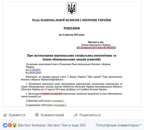 "Капець! Я бачив проект рішення РНБО, в якому було понад 600 компаній і майже 800 осіб, щодо яких продовжуються санкції. Плюс нові об'єкти. Щодо "відкупитися" - маячня. Щодо активів - де факти?", "Переводите ваші пости про корупцію у вищих ешелонах влади в Україні,англійською теж,щоб донести англомовним підписантам", "а чому лише частина документа видно? чому не видно та частина, в якій написано про автоматичну пролонгацію санкцій у разі продовження конфлікту? маніпулюєте знову?", "Добре, що такий кришталево чесний депутат в темі", "Що ви як депутат зробили для продовження санкцій крім балачок?", "Справжня торгівля країною!" - коментують публікацію нардепа користувачі соцмережі.