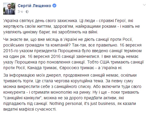 Народний депутат від "Блоку Петра Порошенко" Сергій Лещенко зробив гучну заяву з приводу санкцій України щодо Росії.
