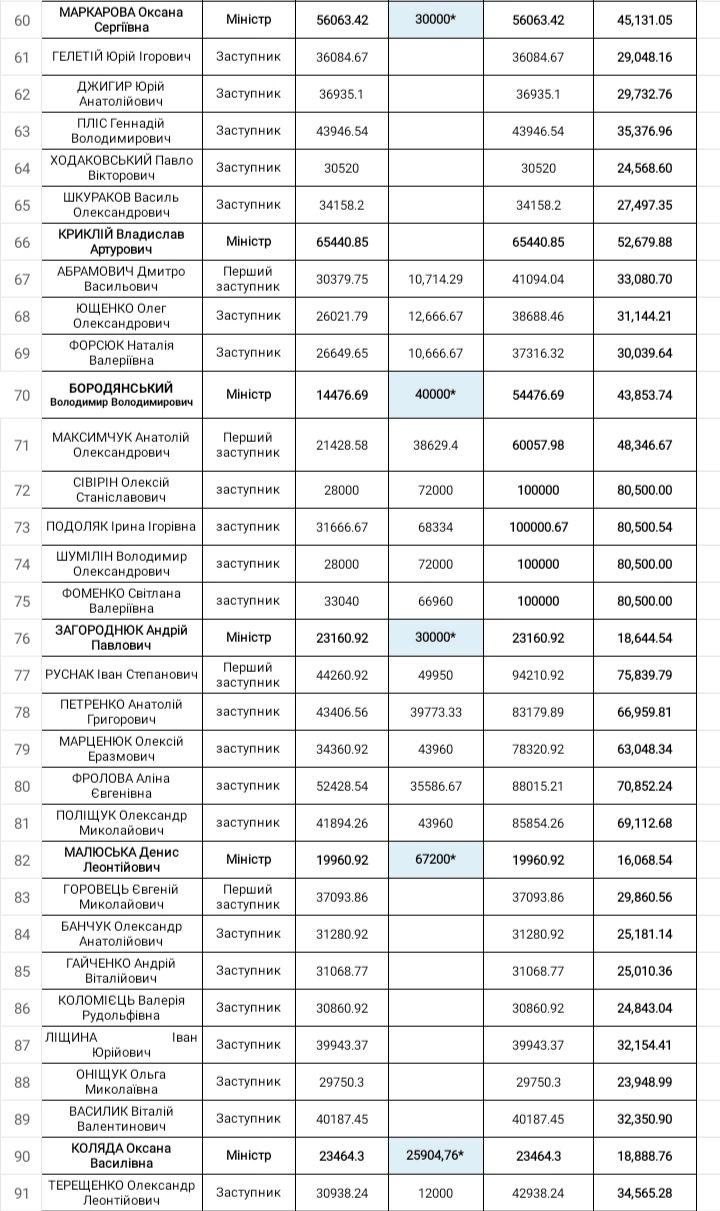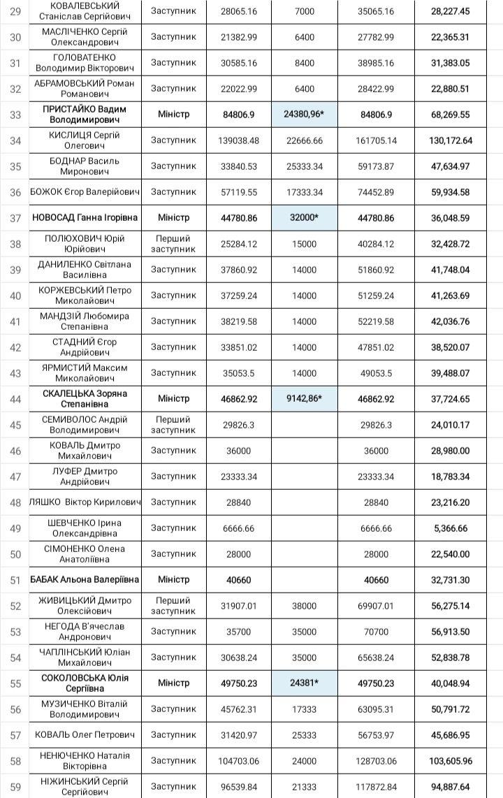 Міністр закордонних справ Вадим Пристайко - 68269,55 грн. Міністр освіти і науки Ганна Новосад - 36048,59 грн.