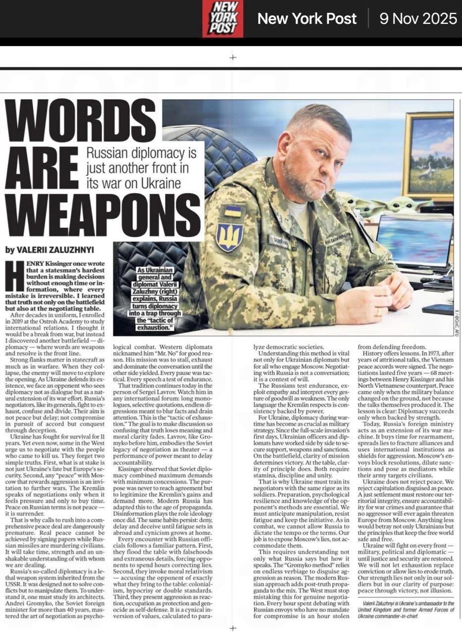 Валерій Залужний — посол України у Великій Британії та колишній головнокомандувач Збройних сил — у своїй колонці для видання The New York Post заявив, що російська дипломатія є не діалогом, а "лише ще одним фронтом" у війні проти України.