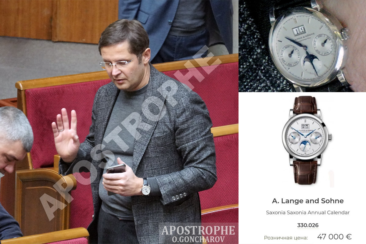 Як видно на кадрі, на руці у народного депутата красується модель шикарного годинника A.Lange & Sohne - Saxonia Saxonia Annual Calendar. Вартість такого хронометра на сайтах, які займаються продажем елітних годинників - 47 тисяч євро, що можна порівняти з вартістю трьохкімнатної квартири в Києві.
