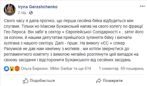 "Свого часу я дала прогноз, що перша сесійна бійка відбудеться між слугами. Тільки но Максим Бужанскьий напав на свого колегу по фракції Гео Лероса. Він забіг в сектор "Європейської Солідарності" , затяг його за колони, й нашим депутатам прийшлося зупиняти бійку і вигнати хулігана з нашого сектору", - написала нардеп.