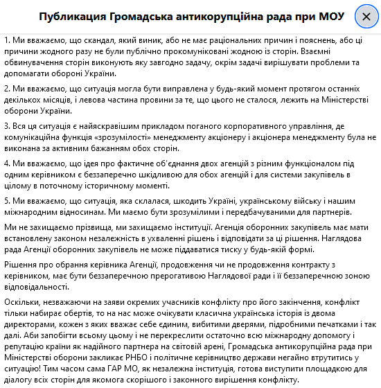 "Аби запобігти всьому цьому і не перекреслити остаточно всю міжнародну допомогу і репутацію країни як надійного партнера на світовій арені, Громадська антикорупційна рада при Міністерстві оборони закликає РНБО і політичне керівництво держави негайно втрутитись у ситуацію! Тим часом сама ГАР МО, як незалежна інституція, готова виступити площадкою для діалогу всіх сторін для якомога скорішого і законного вирішення конфлікту", - йдеться у повідомленні.