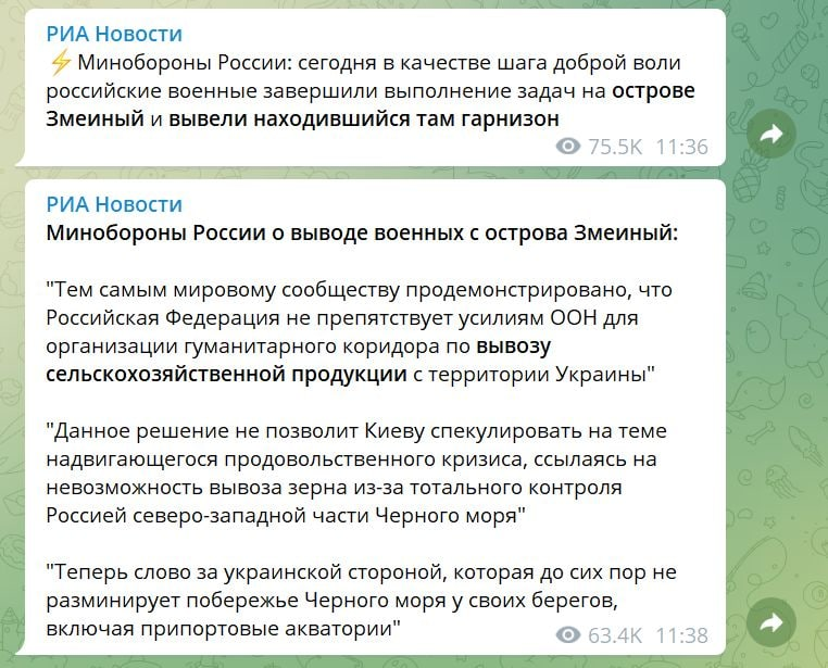 11:10 Українське командування офіційно повідомило про відхід росіян із острова Зміїний
