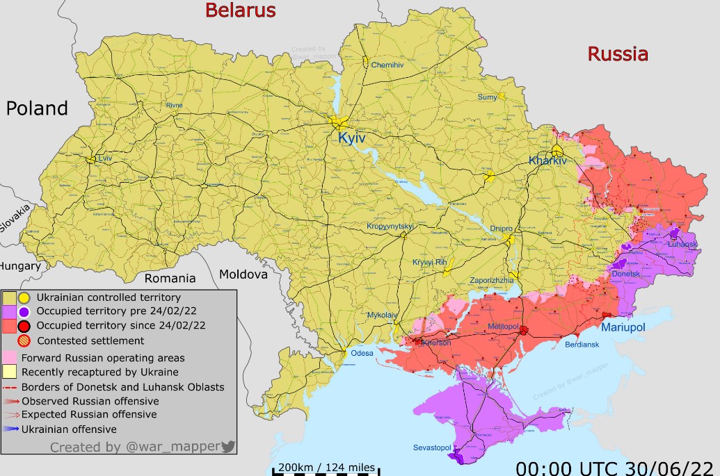 9:54 ЗСУ продовжують утримувати свої позиції у місті Лисичанську після відходу з Сєвєродонецька. Російські сили продовжують повзучий підхід з боку Попасної, усуваючи необхідність у форсуванні річки Сіверський Донець на цій ділянці. Про це повідомляє британська розвідка.